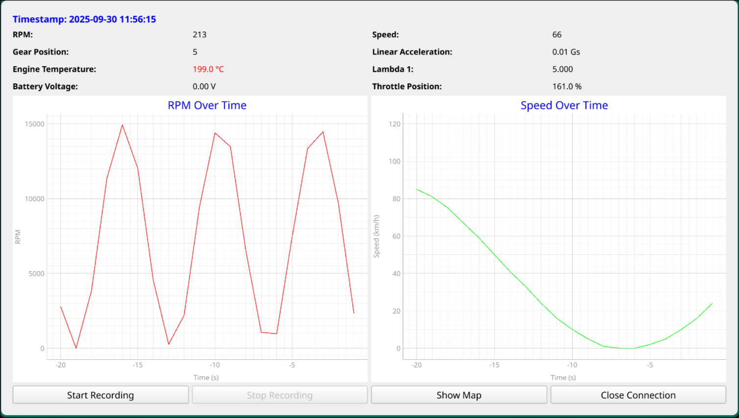 - As you can see, there are two graphs displaying RPM and Speed as well as a few parameters displayed above for easy tracking. You can also press a button to view all the data in the packet or the GPS location rendered dynamically in a map window. You may also notice that there is a button to Start and Stop recording data - this ties into the other piece of software I built, the Analyzer. The client can record data to a CSV file which will then be picked up and read by another program.